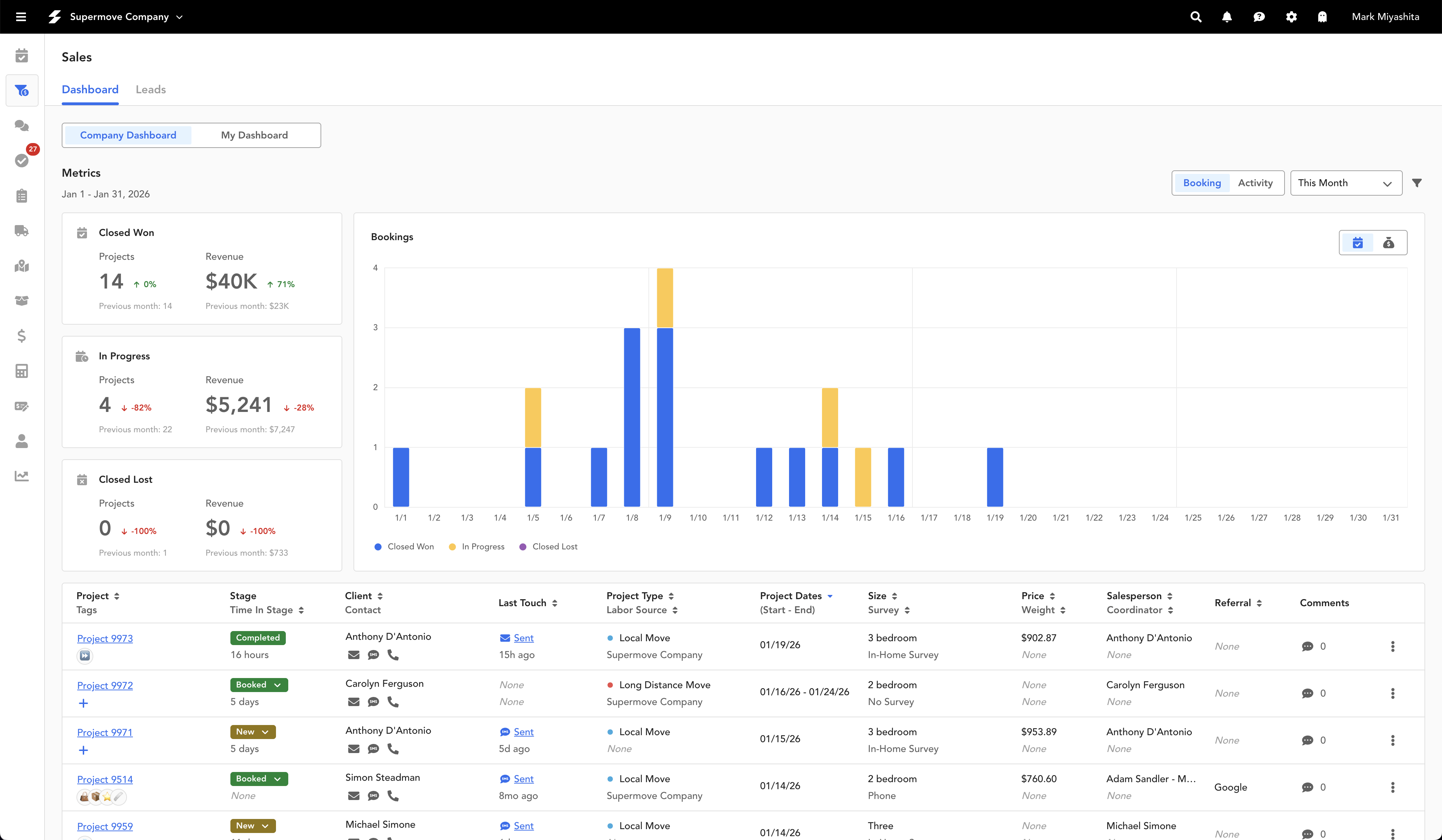Booking Metrics: Closed Won, In Progress, Closed Lost projects and associated revenue.