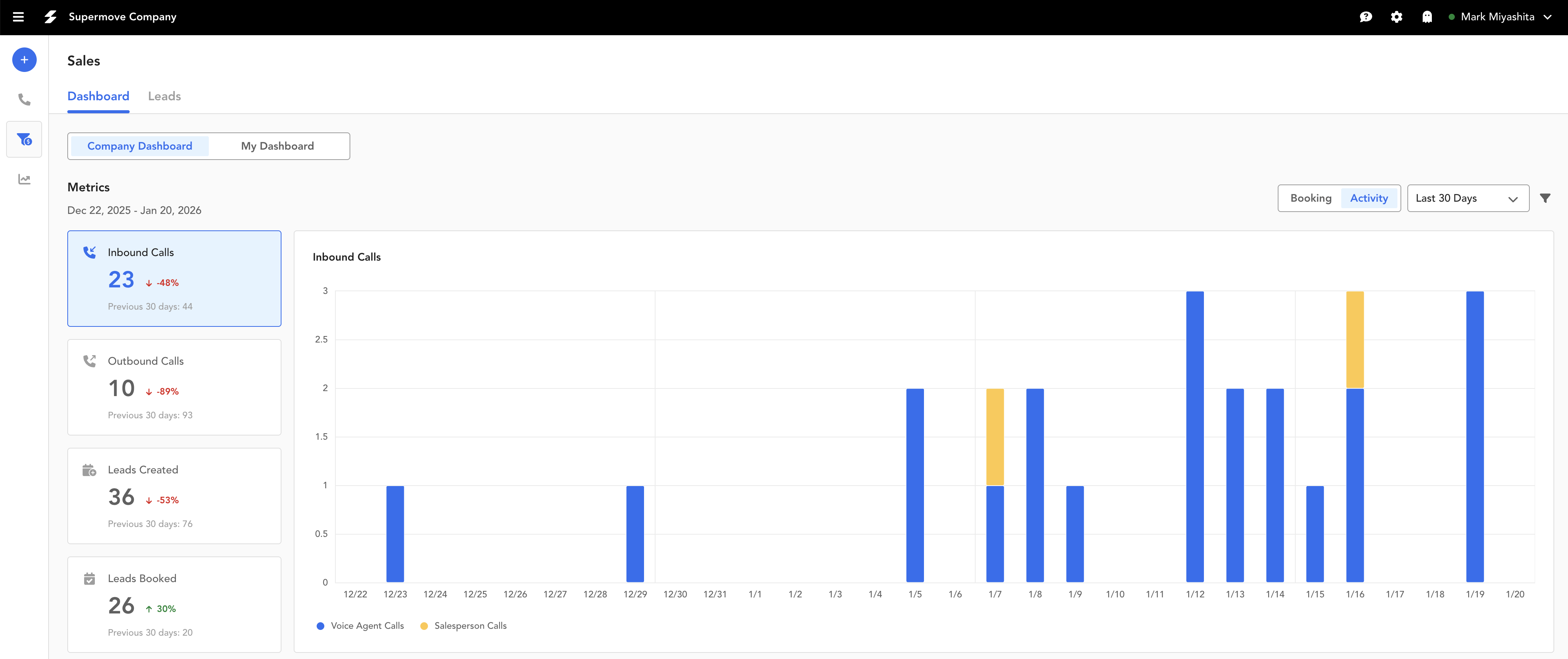 Activity Metrics: Inbound calls, outbound calls, leads created, and leads booked.