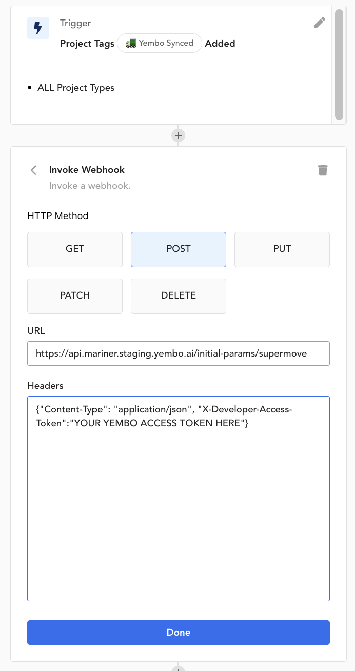 YEMBO_SYNCEDtag is applied or when an update is needed, sending the Supermove Project UUID to Yembo. Link to the Automation Overview Guide which covers how to create a Supermove Automation here. Screenshot example of the automation for the project tag below: